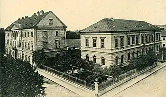 Over the lifetime of the ghetto, about 15,000 children lived in Theresienstadt, of whom about 90% perished after deportation.[6] The Youth Welfare Office (German: Jugendfürsorge) was responsible for their housing, care, and education.[92] Before June 1942, when the Czech civilians were evicted from the town, children lived with their parents in the barracks and were left unsupervised during the day.[55] After the eviction, some of the houses were taken over by the Youth Welfare Office for use as children's homes. The intention was to keep the children somewhat insulated from the harsh conditions in the ghetto so that they would not succumb to "demoralization". Aided by teachers and helpers recruited from former educators and students, the children lived in collectives of 200–300 per house,[93] separated by language.[79] Within each house, children were assigned to rooms by gender and age. Their housing was superior to that of other inmates and they were also better fed.[94]