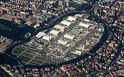 Theresienwiese is an open space in the Munich borough of Ludwigsvorstadt-Isarvorstadt. It serves as the official ground of the Munich Oktoberfest. A space of 420,000 square metres (4,500,000 sq ft),[1] it is bordered in the west by the Ruhmeshalle and the Bavaria statue, symbolizing the State of Bavaria, and in the east by Esperantoplatz, a square named for the international language Esperanto. There, a memorial commemorates the victims of the 1980 Oktoberfest bombing. Bavariaring, an orbital road, provides access to visiting traffic. In the north the towers of the Paulskirche are visible.