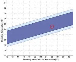 The adaptive model is based on the idea that outdoor climate might be used as a proxy of indoor comfort because of a statistically significant correlation between them. The adaptive hypothesis predicts that contextual factors, such as having access to environmental controls, and past thermal history can influence building occupants' thermal expectations and preferences.[3] Numerous researchers have conducted field studies worldwide in which they survey building occupants about their thermal comfort while taking simultaneous environmental measurements. Analyzing a database of results from 160 of these buildings revealed that occupants of naturally ventilated buildings accept and even prefer a wider range of temperatures than their counterparts in sealed, air-conditioned buildings because their preferred temperature depends on outdoor conditions.[3] These results were incorporated in the ASHRAE 55-2004 standard as the adaptive comfort model. The adaptive chart relates indoor comfort temperature to prevailing outdoor temperature and defines zones of 80% and 90% satisfaction.[1]