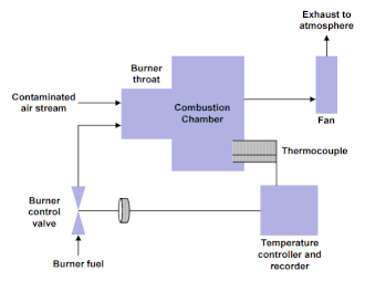 The simplest technology of thermal oxidation is direct-fired thermal oxidizer. A process stream with hazardous gases is introduced into a firing box through or near the burner and enough residence time is provided to get the desired destruction removal efficiency (DRE) of the VOCs. Most direct-fired thermal oxidizers operate at temperature levels between 980 °C (1,800 °F) and 1,200 °C (2,190 °F) with air flow rates of 0.24 to 24 standard cubic meters per second.[1]