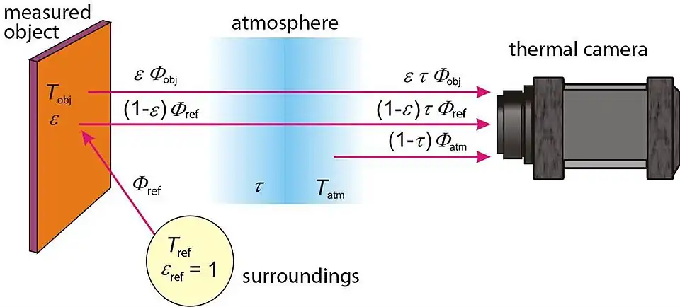 - Thermal radiation from the atmosphere — [W] is the radiant flux emitted by the atmosphere itself. It also accounts for attenuation of radiation traveling from the object to the detector. This contribution is weighted by the atmospheric transmittance [-] and adds an additional source of flux in the measurement.