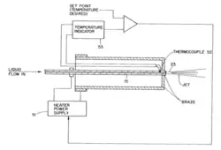 In more technical terms thermospray is the controlled partial vaporization of a liquid as it flows through a heated capillary tube. The nebulization is accomplished by pumping a liquid sample at moderately high pressure through an electrothermally heated capillary tube.[6] When sufficient power is coupled to the flowing sample stream, a partially vaporized mixture is produced consisting of some fraction of vaporized sample and some remaining liquid sample. Upon exiting the heated capillary, the rapidly expanding sample vapor converts the remaining liquid stream to an aerosol. The produced vapor acts as a nebulizing 'gas' and aids the breakup of the liquid stream into droplets,[4] in a process similar to pneumatic nebulization.[7] Thus, conceptually this can be thought of as a pneumatic process where the expanding solvent vapor is used as a nebulizer gas. The solution leaves the tube as a supersonic jet or spray of very small droplets in solvent vapor. Qualitatively, the aerosols appear dense with a moderately narrow particle size distribution.