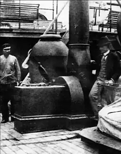 In 1898, Alexander William Stewart patented his invention in the United Kingdom as ‘Improvements in ventilating and heating or cooling apparatus for use on board ship’.[9] The patent envisaged the control of both warm and cool air, although the Thermotank installed in Kostroma delivered warm air only.