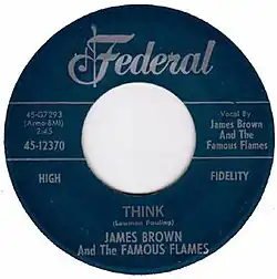 "Think" was released as a single on the King Records subsidiary label Federal Records and charted #7 R&B and #33 pop in June 1960, staying on the latter chart for eight weeks. ("Think"'s B-side, "You've Got the Power", was also a hit, reaching #14 R&B and #86 pop, the latter song only spending a week on the chart.)[4] It was Brown and the Famous Flames' first recording to enter the Pop top 40, and their next-to-last single for the Federal label before they switched to King. "Think" was also included on Brown's 1960 album of the same name.