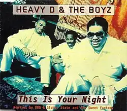 "This Is Your Night" is a song by American rap group Heavy D & the Boyz. It was written by Heavy D and Teddy Riley for their fifth and final studio album, Nuttin' But Love (1994), with production helmed by the latter. The song features vocals from R&B group Blackstreet and contains elements from "Ladies' Night" (1979) by American R&B band Kool & the Gang and also samples George Benson's "Give Me the Night" (1980). Released in 1994 as the album's third international single by MCA and Uptown Records, it reached the top 20 in France and the Netherlands, and was a top-30 hit in Iceland and the UK. "This Is Your Night" was nominated in the category for Tune of the Year at the International Dance Awards 1995.[1]