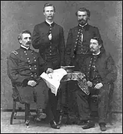 In April and May 1862 Davies was engaged in the Siege of Corinth as a division commander. He took part in the Second Battle of Corinth on October 3–4, 1862, also in division command. Davies was assigned to command the Districts of Columbus, Kentucky, in 1862–63, Rolla, Missouri, in 1863–64, and North Kansas in 1864–65.[3] While in command at Columbus, Davies issued orders that the fortified Union post at Island No. 10 be disarmed with all ammunition destroyed, cannon spiked, and gun carriages burned, directives that seemed so nonsensical to the post commander that they had to be repeated several times before they were obeyed. One military investigator looking into the matter reported to headquarters that Davies' conduct should result in his dismissal from the army "the better for our country, its cause and its treasury."[7] Davies, however, was not dismissed. On January 13, 1866, President Andrew Johnson nominated Davies for appointment to the grade of brevet major general of volunteers, to rank from July 11, 1865, and the United States Senate confirmed the appointment on March 12, 1866.[8] Davies was mustered out of the Union Army on August 24, 1865.[9]