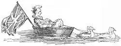 Barry's character was described by an employer as jovial and good-natured.[1] The young W. S. Gilbert was a fan of Barry's as a child and once, starstruck upon recognising him, followed him down a street.[7] In 1844 Barry took part in a stunt where he sailed down the Thames between Vauxhall and Westminster in a tub pulled by four geese.[1] The trick, first devised by Dicky Usher in 1809, was achieved by having the tub pulled by a rowboat attached by an underwater line.[8][1] The stunt was popular at the time; in 1845 a similar trick performed by another clown, Arthur Nelson, caused the deaths of 79 people when a large crowd caused the collapse of Yarmouth suspension bridge.[9]