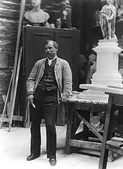 Brock was born on 1 March 1847 in Worcester.[2] He was the only son of a painter and decorator and attended the Government School of Design in Worcester, after which he undertook an apprenticeship in modelling at the Worcester Royal Porcelain Works.[5] In 1866 he became a pupil of the sculptor John Henry Foley and also enrolled in the Royal Academy Schools, where he won a gold medal for sculpture in 1869.[5][6] He met and befriended Frederic, Lord Leighton, whose emphasis on realism and naturalism in sculpture led Brock to become part of the New Sculpture movement and to develop his talent for sympathetic and realistic portraiture.[4] After Foley's sudden death in 1874, Brock finished several of his commissions, including the monument to Daniel O'Connell in Dublin and a large bronze equestrian statue of Lord Canning for Kolkata.[5][7][8] It was his completion of Foley's statue of Prince Albert for the Albert Memorial which first brought Brock to prominence and secured his position as an establishment sculptor.[7][6][9] He also assisted in the casting of Lord Leighton's greatly influential 1877 sculpture An Athlete Wrestling with a Python.[10]
