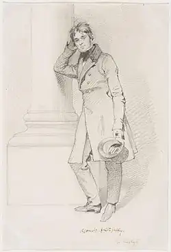 In the summer of 1818, following an expedition with Irving through the moors of Peebles and Moffat, Carlyle made his first attempt at publishing, forwarding an article describing what he saw to the editor of an Edinburgh magazine, which was not published and is now lost.[29] In October, Carlyle resigned from his position at Kirkcaldy, and left for Edinburgh in November.[30] Shortly before his departure, he began to suffer from dyspepsia, which remained with him throughout his life.[31] He enrolled in a mineralogy class from November 1818 to April 1819, attending lectures by Robert Jameson,[32] and in January 1819 began to study German, desiring to read the mineralogical works of Abraham Gottlob Werner.[33] In February and March, he translated a piece by Jöns Jacob Berzelius,[34] and by September he was "reading Goethe".[35] In November he enrolled in "the class of Scots law", studying under the advocate David Hume.[36] In December 1819 and January 1820 Carlyle made his second attempt at publishing, writing a review-article on Marc-Auguste Pictet's review of Jean-Alfred Gautier's Essai historique sur le problème des trois corps (1817), which went unpublished and is lost.[37] The law classes ended in March 1820 and he did not pursue the subject any further.[38]