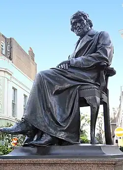 In May 1840 Carlyle gave his fourth and final set of lectures, which were published in 1841 as On Heroes, Hero-Worship, & the Heroic in History. Carlyle wrote to his brother John afterwards, "The Lecturing business went of [sic] with sufficient éclat; the Course was generally judged, and I rather join therein myself, to be the bad best I have yet given."[93] In the 1840 edition of the Essays, Carlyle published "Fractions", a collection of poems written from 1823 to 1833.[94] Later that year, he declined a proposal for a professorship of history at Edinburgh.[95] Carlyle was the principal founder of the London Library in 1841.[96] He had become frustrated by the facilities available at the British Museum Library, where he was often unable to find a seat (obliging him to perch on ladders), where he complained that the enforced close confinement with his fellow readers gave him a "museum headache", where the books were unavailable for loan, and where he found the library's collections of pamphlets and other material relating to the French Revolution and English Civil Wars inadequately catalogued. In particular, he developed an antipathy to the Keeper of Printed Books, Anthony Panizzi (despite the fact that Panizzi had allowed him many privileges not granted to other readers), and criticised him in a footnote to an article published in the Westminster Review as the "respectable Sub-Librarian".[97] Carlyle's eventual solution, with the support of a number of influential friends, was to call for the establishment of a private subscription library from which books could be borrowed.[98]