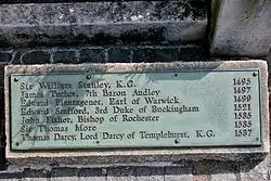 They were condemned to suffer the extreme penalty for treason, but the punishment actually inflicted upon them was decapitation, which Lord Hussey underwent at Lincoln, where he was conveyed on purpose to strike terror where the insurrection had begun. But Darcy was beheaded on Tower Hill on 30 June.[1] His head was set up on London Bridge, and his body, according to one contemporary writer, was buried at Crutched Friars. But if so, it must have been removed afterwards; at least, if a tombstone inscription may be trusted, it lies with the bodies of other Darcys in the church of St Botolph's Aldgate.[3]