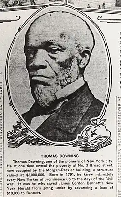 Thomas Downing (c. 1791–1866) was an American restaurateur and abolitionist active in New York City during the Victorian era, who was nicknamed the "New York Oyster King". He was one of the wealthiest people in New York City at the time of his death. He spent his life prohibited from acquiring U.S. citizenship, until the Civil Rights Act of 1866 was passed, the day before he died.[1]