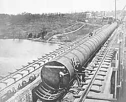 After the Civil War, a severe and prolonged shipbuilding slump devastated New York's shipbuilding industry,[22][23] and although the Continental Iron Works continued to build the occasional ship, it diversified into other areas, notably the supply of equipment for the burgeoning gas lighting industry, including the manufacture of gas holders, gas mains and entire gasworks.[19][24][23] The company also manufactured its own line of boilers, and became a pioneer in welding technology,[19][24] producing welded boiler furnaces, gas-illuminated buoys, steel digesters for the wood-pulping industry, and other products.[23] From time to time it also manufactured munitions, notably welded torpedo casings, and depth charge casings during World War I. After this war, the company increasingly focused on the manufacture of gas mains and large welded water pipes.[25] The company was liquidated in 1928,[26] following the retirement of Rowland's son.[27]