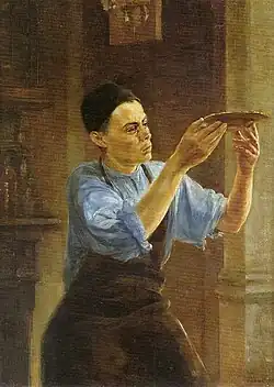 In 1882, he had his first exhibition at the "Imperial Liceu de Artes e Ofícios" in Rio de Janeiro[1] and had great success with some canvases he had painted while still living in Germany. This resulted in a commission to decorate the Hall of Fame at the Academy of Portuguese Literature, which he did together with Grimm.[1] The following year, he created stained glass windows for the church of Saint Francis of Paola. In 1884, he entered the "Exposição Geral de Belas Artes" held by the Academia Imperial de Belas Artes and won a Gold Medal.[2]