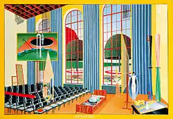 Thomas Huber is an artist who fuses image and text and lectures on his pictures. He realises his conception of the image in various mediums: paintings, aquarelle, drawings, objects, graphic arts, art within architecture, artist lectures, and artists books. For instance, his painting Rede in der Schule ("Lecture in the School") depicts the main auditorium in the Kunstakademie Düsseldorf.