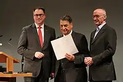 The Thomas Mann Prize 2019 to Claudio Magris (center) was awarded in the Bavarian Academy of Fine Arts by Jan Lindau, Mayor of the Hanseatic City of Lübeck (left) and Winfried Nerdinger, President of the Academy (right).