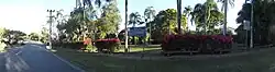 The Harts Road boundary is defined by large bougainvillea hedges (of the reddish-pink thomasii variety) interspersed with tall, regularly spaced Cocos Palms (arecastrum romanzoffianum). While there are gaps in both the bougainvillea hedges and the palm avenue, the visual effect of this planting scheme remains intact. A metal trellis archway, of narrow metal poles set in concrete footings, stands at the original pedestrian entrance to the gardens, with the bougainvillea on either side trained to grow over it. A low timber log fence along this boundary is not of cultural heritage significance.[1]