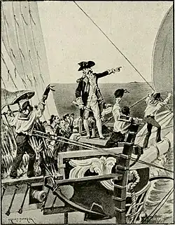 Thomas Read was the son of John and Mary Read, and the younger brother of U.S. statesman George Read. A brother worked in Havana, and Read early took up a life on the ocean, where he was master of vessels in the trans-Atlantic and West Indies trade.[1] He was appointed, on 23 October 1775, commodore of the Pennsylvania Navy, having as the surgeon of his fleet Benjamin Rush, and while holding this command he made a successful defence of the Delaware River. He was appointed, 7 June 1776, to the highest grade in the Continental Navy, and assigned to one of its four largest ships, the 32-gun frigate George Washington, then being built on the Delaware River. While awaiting the completion of his ship he volunteered for land service, and was sent as captain by the committee of safety to join George Washington. He gave valuable assistance in the crossing of the Delaware, and at the Battle of Trenton commanded a battery made up of guns from his frigate, and with it raked the stone bridge across Assunpink Creek.