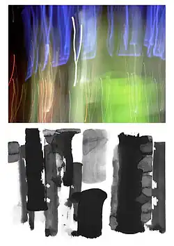 Since the beginning of his career, Reinhold has been interested in photography. In his 1977 “Ferris wheel series” he addresses issues of space, time and chronology. The series’ central motif, the “Wiener Riesenrad” (Viennese Ferris wheel) stands for questions of mobility and immobility, object and its image.[5] In 2010, Reinhold lived in Shanghai for three months, where worked on the series “Brushstrokes of Light, Living Shades”. The photographs for this series were taken by night, and the resulting images recall the superimposition techniques employed in Reinhold‘s paintings. The paintings in the series are ink paintings made with a Chinese calligraphy brush, which remind the beholder of the early days of photography. Both the motifs and the technique are linked to the city Shanghai.