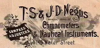 In 1848, Negus and his brother John D. Negus founded the firm of T.S. & J.D. Negus, which manufactured and sold maritime chronometers and nautical instruments at 140 Water Street, New York City near the East River. The firm made chronometers for the United States Navy as well as shipmasters and yachtsmen. Their instruments were among the best manufactured in the country. The firm traded as T. S. Negus & Co. in 1864 and as T.S. & J.D. Negus in 1869. The firm was described as "probably the most prolific American Chronometer manufacturer" up through the first quarter of the 20th century.[2] From 1886 to 1887, in competitive trials of chronometers at the United States Naval Observatory, located in Washington, D. C., their chronometers passed first place in a list of 45 chronometers submitted for testing.[3][4] Sea captains came to the shop to purchase and have their chronometers tested, rated and certified.[5]