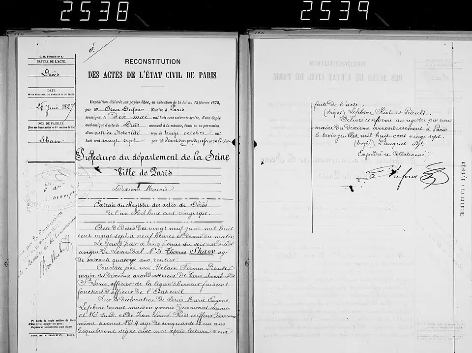 The act is backdated to 29 June 1827 and states that on the previous day (28 June 1827) at 5 pm, at number 21 avenue de Lowendal, died a 74 year old individual named Thomas Shaw. His activity, indicated as "rentier".