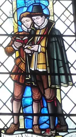 ![]() Detail from a stained glass window in St Peter's Catholic Church, Winchester. Thomas is on the right. | |