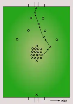 Like other English public schools, Rugby had evolved its own variant of football.[38] The game in Wills's era—a rough and highly defensive struggle often involving hundreds of boys—was confined to a competition amongst the houses.[39] Spanning his school years, Wills is one of the few players whose on-field exploits feature in the newspapers' otherwise brief match reports.[40] His creative play and "eel-like agility" baffled the opposition, and his penchant for theatrics endeared him to the crowds.[41] One journalist noted his use of "slimy tricks", a possible early reference to his gamesmanship.[41] As a "dodger" in the forward line who served his house's kicker, he took long and accurate shots at goal.[42] Wills also shone in the school's annual athletics carnival and frequently won the long-distance running game Hare and Hounds.[43]
