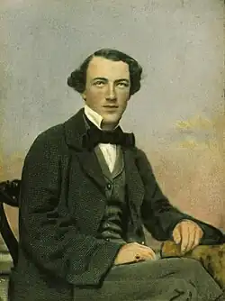 Wills returned to Australia aboard the Oneida steamship, arriving in Melbourne on 23 December 1856. The minor port city of his youth had risen to world renown as the booming financial centre of the Victorian gold rush.[58] Horatio, now a member of the Legislative Assembly in the Victorian Parliament, lived on "Belle Vue", a farm at Point Henry near Geelong, the Wills' family home since 1853.[59] In his first summer back in Melbourne, Wills stayed with his extended family, the Harrisons, at their home on Victoria Parade, and entered a Collins Street law firm to appease his father, but he seems never to have practised; the few comments he made about law suggest it meant little to him.[60] "Tom was no dunce", writes Greg de Moore. He was "negotiating a path to greatness."[61]