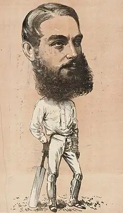 After leaving Rugby, and with a steady supply of money from his father, Wills roamed Britain in pursuit of cricketing pleasure. Regarded as "one of the most promising cricketers in the kingdom",[52] he played with royalty, made first-class appearances for the MCC, Kent County Cricket Club, and various Gentlemen sides, and also fell in with the I Zingari—the "gypsy lords of English cricket"—a club of wealthy amateurs known for their exotic costumes and hedonistic lifestyles.[53] Against Horatio's wishes, Tom, having failed to matriculate, did not continue his studies at Cambridge, but played for the university's cricket team (as well as Magdalene College), most notably against Oxford in 1856 when rules barring non-students from playing in the University Match were ignored, Cambridge claiming to be "one man short".[54] In June, Wills played cricket at Rugby School for the last time, representing the MCC alongside Lord Guernsey, the Earl of Winterton, and Charles du Cane, governor-to-be of Tasmania.[55] Following a month of cricket in Ireland, Wills, at the behest of Horatio, returned to England to prepare for his journey home to Australia.[56]