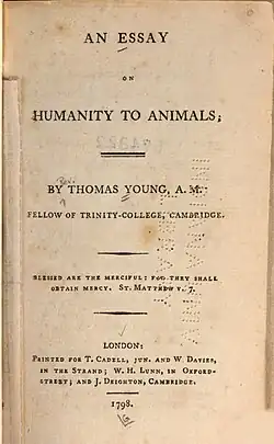 ![]() First edition title page of An Essay on Humanity to Animals (1798) | |