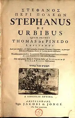 Pinedo is best known for his edition of Stephan of Byzantium's Ethnica, which he provided in Greek with a parallel Latin translation and commentary, including numerous citations from Jewish historians and travelers such as Josephus and Benjamin of Tudela.[11]