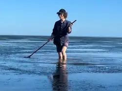Thompson Beach is particularly known for its blue swimmer crabs, with the prime season being from October to April. The beach has an extremely gradual incline, allowing a fisherman to walk several hundred meters out to sea during low tide while the water remains below knee level: this provides a vast area for crabbing. Special crab rakes are employed to capture these crabs around seagrass patches.[8] It is advised to handle the crabs gently to prevent damage and adhere to strict limits enforced by the PIRSA: a personal daily bag limit of 20 (combined with sand crabs), a daily boat limit of 60 (for groups of 3 or more), and a minimum legal size of 11 cm. Females with external eggs must be released immediately.[9]