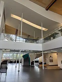 The Faculty is currently housed in the third and fourth floor of the Old Main building of Thompson Rivers University. Following a $20.2-million renovation, the two floors opened 2014, providing 45,000-square-feet of learning, library, and student spaces, under an undulating 400-foot-long wooden roof. The south side contains double-height spaces for the reading room and main teaching areas, while the north houses the law library and offices with views of Mt. Peter and Mt. Paul. The design incorporates elements reflecting regional First Nations heritage, including cedar finishes and facade patterns inspired by traditional basket-weaving techniques. A central north-south atrium serves as the main circulation and gathering space.[23]