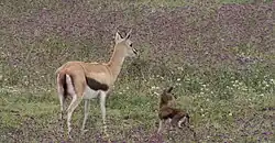 A male gazelle follows a female and sniffs her urine to find out if she is in estrus, a process known as the Flehmen response.[24] If so, he continues to court and mount her.[23] Females leave the herd to give birth to single fawns after a five- to six-month gestation period.[25] Breeding takes place year-round, with a peak in births around January/February, and in some populations a second peak around June/July.[26] Newborn fawns weigh 2 to 3 kg (4.4 to 6.6 lb). They give birth twice yearly with one or two fawns.[18] When giving birth, a female gazelle crouches as the newborn fawn drops to the ground, tearing the umbilical cord.[27] The mother then licks the fawn clean of amniotic fluid and tissues.[27] In addition, licking possibly also serves to stimulate the fawn's blood circulation, or to "label" it so its mother can recognize it by scent.[27]