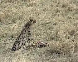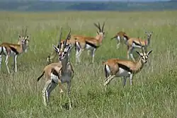 Thomson's gazelles are dependent on short grass.[18] Their numbers can be highly concentrated at the beginning of the rains when the grass grows quickly.[18] In the Serengeti, they follow the larger herbivores, such as plains zebras and blue wildebeests as they mow down the taller grasses.[18] In the wild, Thomson's gazelles can live 10–15 years. Their major predators are cheetahs, which are able to attain higher speeds, but gazelles can outlast them in long chases and are able to make turns more quickly.[19] This small antelope can run extremely fast, up to 80 km/h (50 mph),[20] and zigzag, an adaptation which often saves it from predators. Sometimes, they are also taken by leopards, lions, African wild dogs, hyenas, Nile crocodiles and African rock pythons, and their fawns are sometimes the prey of eagles, jackals, and baboons. A noticeable behaviour of Thomson's gazelles is their bounding leap, known as stotting or pronking, used to startle predators and display strength.