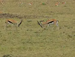 During the wet season, a time when grass is abundant, adult male gazelles graze extensively. They spread out more and establish breeding territories.[21] Younger males usually spend their time in bachelor groups, and are prevented from entering the territories.[22] Females form migratory groups that enter the males' territories, mostly the ones with the highest-quality resources.[22] As the female groups pass through and forage, the territorial males may try to herd them, and are usually successful in preventing single females from leaving, but not whole groups.[17][22] Subadult males usually establish dominance through actual combat, while adults are more likely to do rituals.[17] If a bachelor male should be passing through a territorial male's region, the male will chase the offender out of his territory.[17]