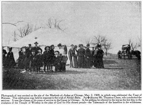 Tent raised at the site of the future Baháʼí Temple near Chicago for the Feast of Ridván, noting especially Thornton Chase with the ✚ above him.