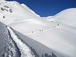 Thorong La or Thorung La is a mountain pass with an elevation of 5,416 metres (17,769 ft) above sea level in the Damodar Himal, north of the Annapurna Himal, in central Nepal. Thorong Ri is on the slope of Khatung Kang and Yakawa Kang are the mountains forming Thorong La. The pass is located on a trail that connects the village of Manang in the Manang District to the east, with the temple of Muktinath and the nearby village of Ranipauwa, in the Mustang District to the west. Thorong La is the highest point on the Annapurna Circuit, a 300 km (190 mi) route around the Annapurna mountain range. In addition to trekkers, the pass is regularly used by local traders.