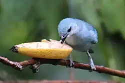 Azure-shouldered tanagers are frugivorous and feed on fruit, flowers, and leaves.[6][10] Species consumed include Psychotria constricta and P. velloziana,[10] the fruit of melastomes, Livistona palms,[6] and Eugenia umbelliflora,[11] flowers and leaves of Acnistus arborescens and Solanum species, and Sechium leaves. The species' habit of eating leaves is an unusual aspect of its diet.[10] Like other tanagers, azure-shouldered tanagers will chew fruit and leave parts of the fruit below the tree; although they have small gapes, they will crush larger fruit externally, allowing them to eat fruit of a variety of sizes. A study of network organization in Brazilian Atlantic Forest found the azure-shouldered tanager to have the third-largest contribution to the network topology, a fact that may be attributable to its highly frugivorous diet.[12] A study of seed dispersal in E. umbelliflora found that although azure-shouldered tanagers are likely to move seeds to places that are favorable for germination, they have a low probability of seed removal.[11]