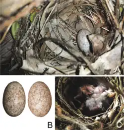 Nests are shallow bottom-supported cups and are made mainly of long strips from dry bromeliad or other leaves. The rim of the nest is lined with thin vines and the nest chamber is lined with fine plant fibers, grass leaves, and occasionally black fungal hyphae. The exact material used to line the nests can vary slightly between individuals. Nest chambers in two measured nests had an outer diameter of 13.8–15.4 cm (5.4–6.1 in), an inner diameter of 6.7–7.2 cm (2.6–2.8 in), a depth of 2.9–4.0 cm (1.1–1.6 in), and a height of 5.3–7.6 cm (2.1–3.0 in).[8]