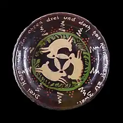 The three hares (or three rabbits) is a circular motif appearing in sacred sites from China, the Middle East and the churches and synagogues of Europe, in particular those of Devon, England (as the "Tinners' Rabbits").[1][2] It is used as an architectural ornament, a religious symbol, and in other modern works of art[3][4] or a logo for adornment (including tattoos),[5] jewelry, and a coat of arms on an escutcheon.[6][7] It is viewed as a puzzle, a visual challenge, and has been rendered as sculpture, drawing, and painting.