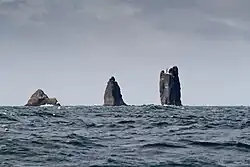 Þrídrangaviti Lighthouse (transliterated as Thrídrangaviti) is an active lighthouse 7.2 kilometres (4.5 miles) off the southwest coast of Iceland, in the archipelago of Vestmannaeyjar. It is often described as one of the most isolated lighthouses in the world.[2][3] Þrídrangar means "three rock pillars", referring to the three named sea stacks at that location: Stóridrangur (on which the lighthouse stands), Þúfudrangur, and Klofadrangur.[4] The lighthouse was commissioned on 5 July 1942.[5]