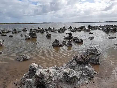 - ^ Warden, John G.; Coshell, Lee; Rosen, Michael R.; Breecker, Daniel O.; Ruthrof, Katinka X.; Omelon, Christopher R. (2019). "The importance of groundwater flow to the formation of modern thrombolitic microbialites". Geobiology. 17 (5): 536–550. doi:10.1111/gbi.12344. ISSN 1472-4677. PMID 31119865. S2CID 162181645.