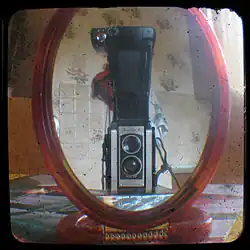 Through the Viewfinder (TtV) photography is a photographic or videographic technique in which a photograph or video or motion picture film is shot with one camera through the viewfinder of a second camera. The viewfinder thus acts as a kind of lens filter.[1][2][3] The most popular method involves using a digital camera as the image taking camera and an intact twin-lens reflex camera (TLR) or pseudo-TLR as the "viewfinder" camera.[4] TLRs typically have square waist-level viewfinders, with the viewfinder plane at 90 degrees to the image plane. The image in a TLR viewfinder is laterally reversed, i.e. it is a mirror image. Most photographers use a cardboard tube or other apparatus connecting the two cameras in order to eliminate stray light and prevent reflections from appearing on the viewfinder glass or on the lens of the imaging camera.