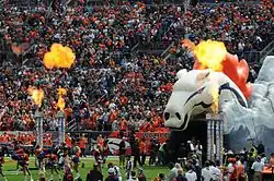 Thunder leads the team onto the field at the beginning of each home game,[12] and typically gallops from one end of the field to the other whenever the team makes a touchdown.[13] He may also make a run after a field goal, but not a safety.[14] Each time he makes a run, a four-person crew runs down the sidelines to the end zone to escort Thunder back to his sideline position. Extra handlers ensure the safety of the horse and surrounding people.[15] Thunder's helpers also remove any manure that he might drop while on the field.[4] As well as his support crew, Thunder has a bodyguard who travels to the games.[16][17] Thunder shares mascot duties with Miles, a human who wears a horse head mask atop a Broncos uniform.[13]