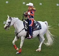 The original Thunder, also known as Thunder Sr., was retired in 2004 after serving 11 years as the team mascot.[2][8] Magness-Blake replaced him with Thunder II,[2] a 1994 Arabian gelding registered as Winter Solstyce.[9] He was Magness-Blake's personal pleasure riding horse prior to taking on his new role as team mascot.[10] As Thunder II grew older, Magness-Blake anticipated the need for a replacement and added a third gray horse to the team. He became known as Thunder III, a 2000 Arabian gelding registered as Me N Myshadow. Thunder III initially served as the understudy for Thunder II,[9] and was trained specifically for the role of team mascot from his start under saddle.[11]