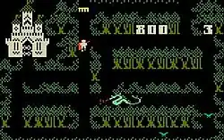 In Thunder Castle, the player controls the knight via the Intellivision direction disc, moving the knight up, down, left and right in the maze. The knight continues in that direction pushed until a turn is possible.[3] The game can be played single-player or two-players alternating.[2] The game is set in three mazes: a forest, a castle and a dungeon. The player guides their knight through these mazes, slaying three dragons in the forest maze, six sorcerers in the castle maze, and nine demons in the dungeon maze.[4][3] Magical objects are scattered throughout the maze which may help or hinder the knight. After completing the final maze, the game restarts with enemies moving faster.[4] The player can energize their knight for a few seconds by interacting with a bat in the forest, a mouse in the castle or a red skull in the dungeon. Being energized lets the knight slay a monster.[5][6] Each of the mazes contain gates. Magical creatures can move through the gates, while the knight can not.[7] Scattered throughout the mazes are various magical items which are activated by using any of the action buttons on the Intellivision controller.[8] These items have the ability to freeze monsters for a few seconds, energize the knight, increase his speed, let him move through a gate, or teleport him to a random location in the maze.[9] Collecting the comb item will cut the player's score in half.[10]