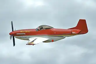 The Thunder Mustang is a 3/4-scale composite kitplane replica of the P-51 Mustang, powered by a modern, 640-horsepower, normally aspirated, water-cooled Falconer V-12 piston engine, enabling speeds approaching that of the original P-51 fighter.[1][2][3] It is a low-wing, monocoque design, with retractable, conventional (tailwheel) landing gear.[2]