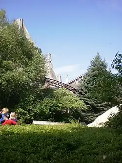 Thunder Run is a powered roller coaster, themed after a runaway mine train, found at Canada's Wonderland, in Vaughan, Ontario, Canada. Rather than having a traditional chain lift hill, the train has an electric motor on board. The train (consisting of nine cars of two rows of two seats, plus an extra single row at the front of the train) flies directly into the Wonder Mountain, the artificial mountain that is a trademark of the park. The coaster opened on May 23, 1981,[1] and operated until 1985 as Blauer Enzian ("Blue Gentian" in German), but in 1986 it was relocated, extended, and incorporated into the Wonder Mountain.