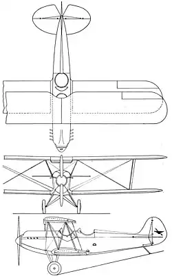 The prototype's OX-5 water-cooled engine was cleanly cowled, with its 43 US gal (36 imp gal; 160 L) fuel tank immediately behind it and its radiator centrally positioned on the upper wing underside. There were two open cockpits in tandem. The forward one seated either two passengers side-by-side or a trainee pilot, positioned largely under the upper wing. The pilot sat, sightly raised, in the rear cockpit. The stagger and a gentle cut-out enhanced the field of view from both cockpits. Behind the engine the fuselage was a trapezoidal section girder structure of welded steel tubes, tapering rearwards and with a rounded decking behind the cockpits.[2][1]
